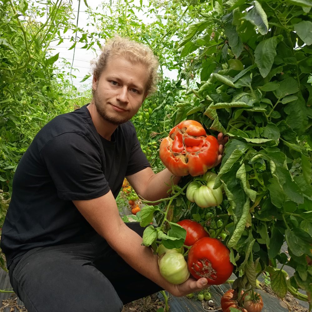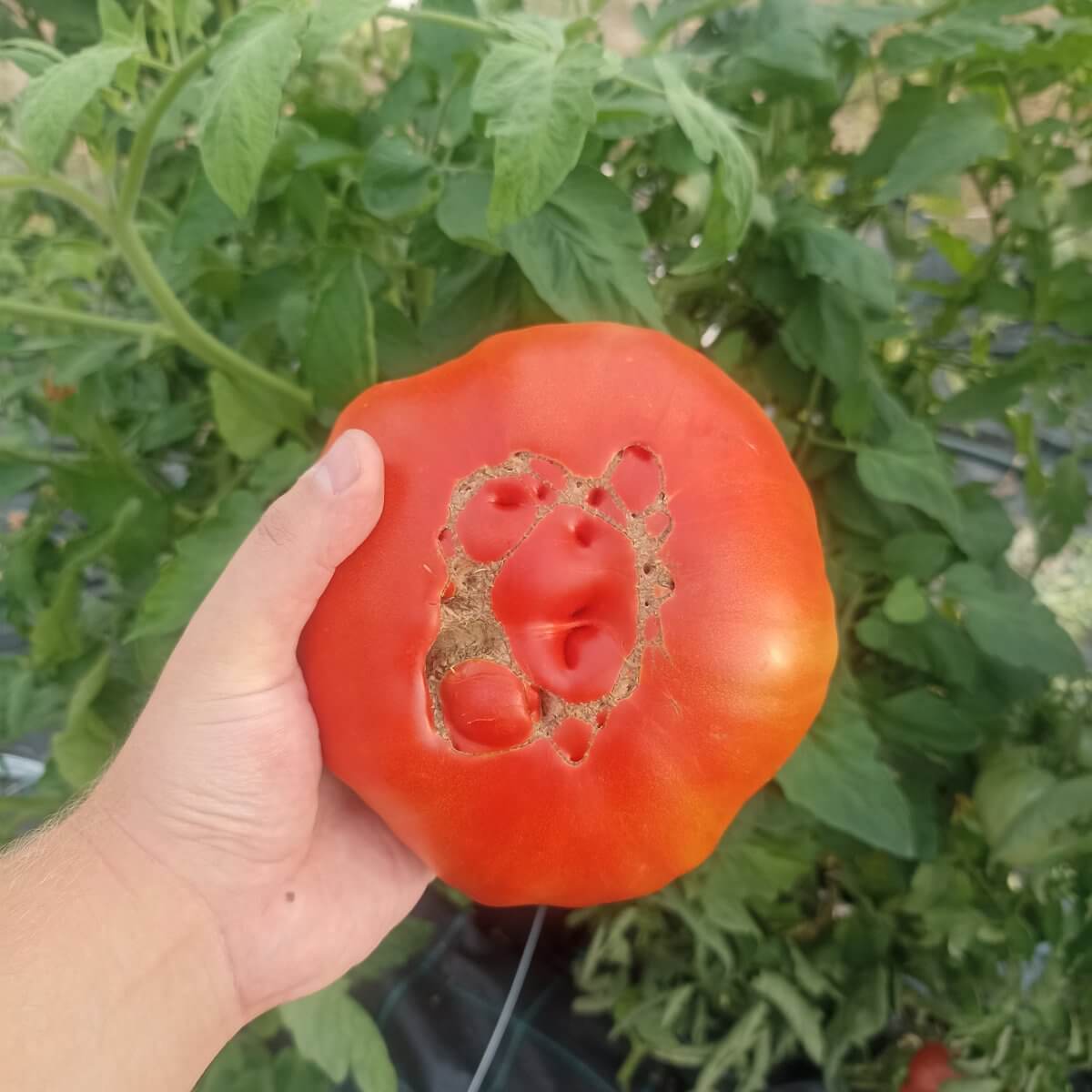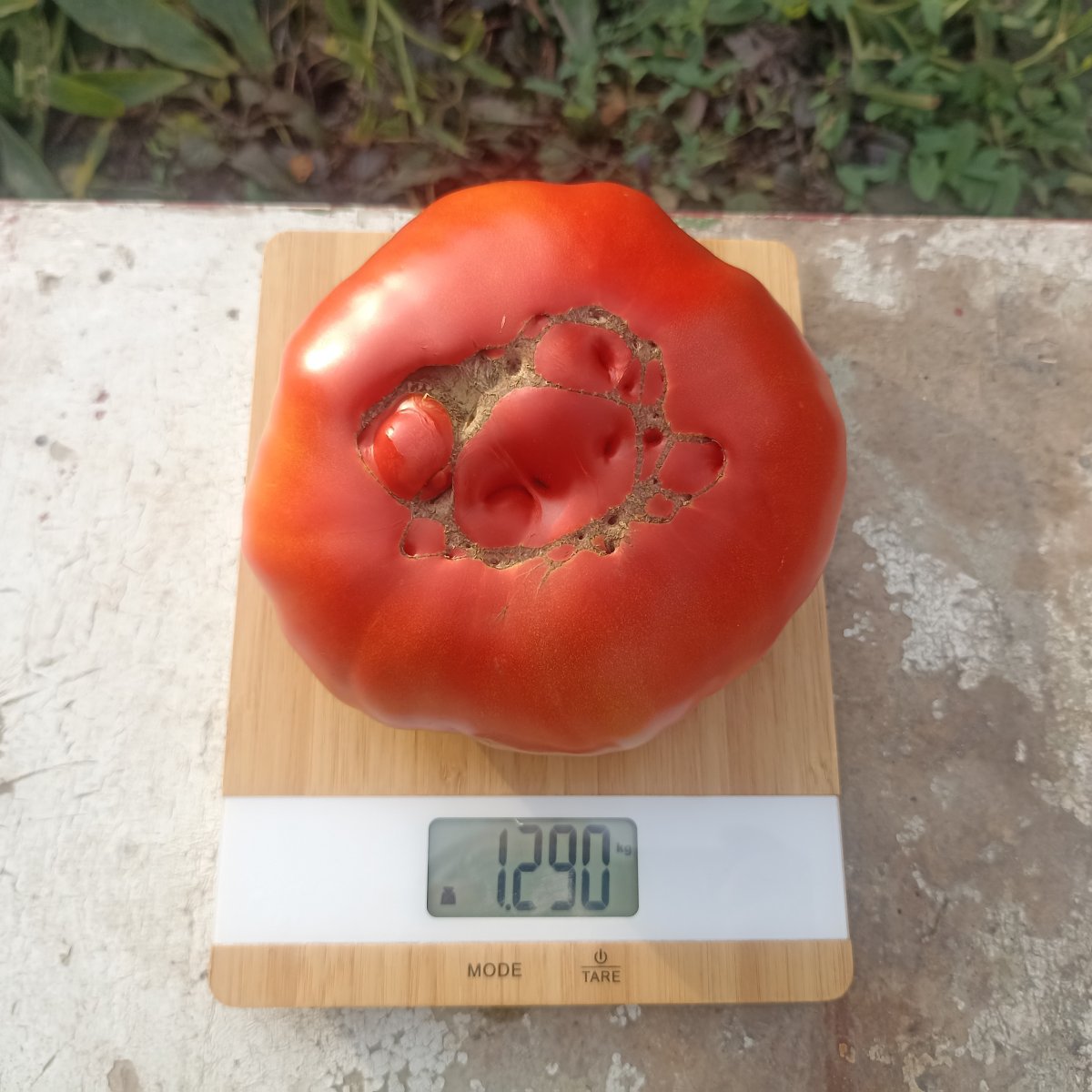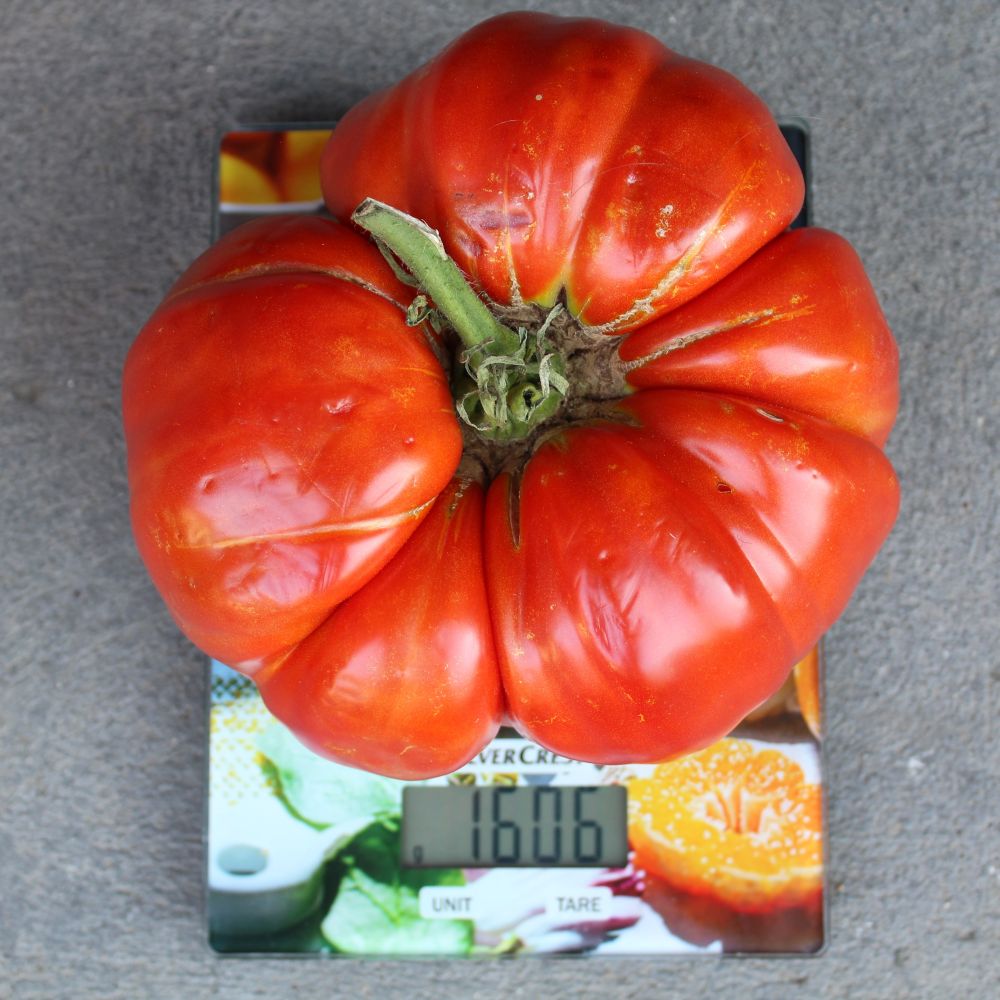 Habitus: Indeterminált, végleges magassága 2,5 méter. Nehezen írható le milyen robosztus növény, A hajtáscsúcsa a növekedése alatt nem vékonyodott el, a kiló feletti termések nevelése alatt is hatalmas növekedési potenciálja volt. A növény 2 méter magasan is 2-2,5 cm-es (hüvelykujjnyi) vastagságú volt. Fürtjeiben 1-4 termést nevel ki.